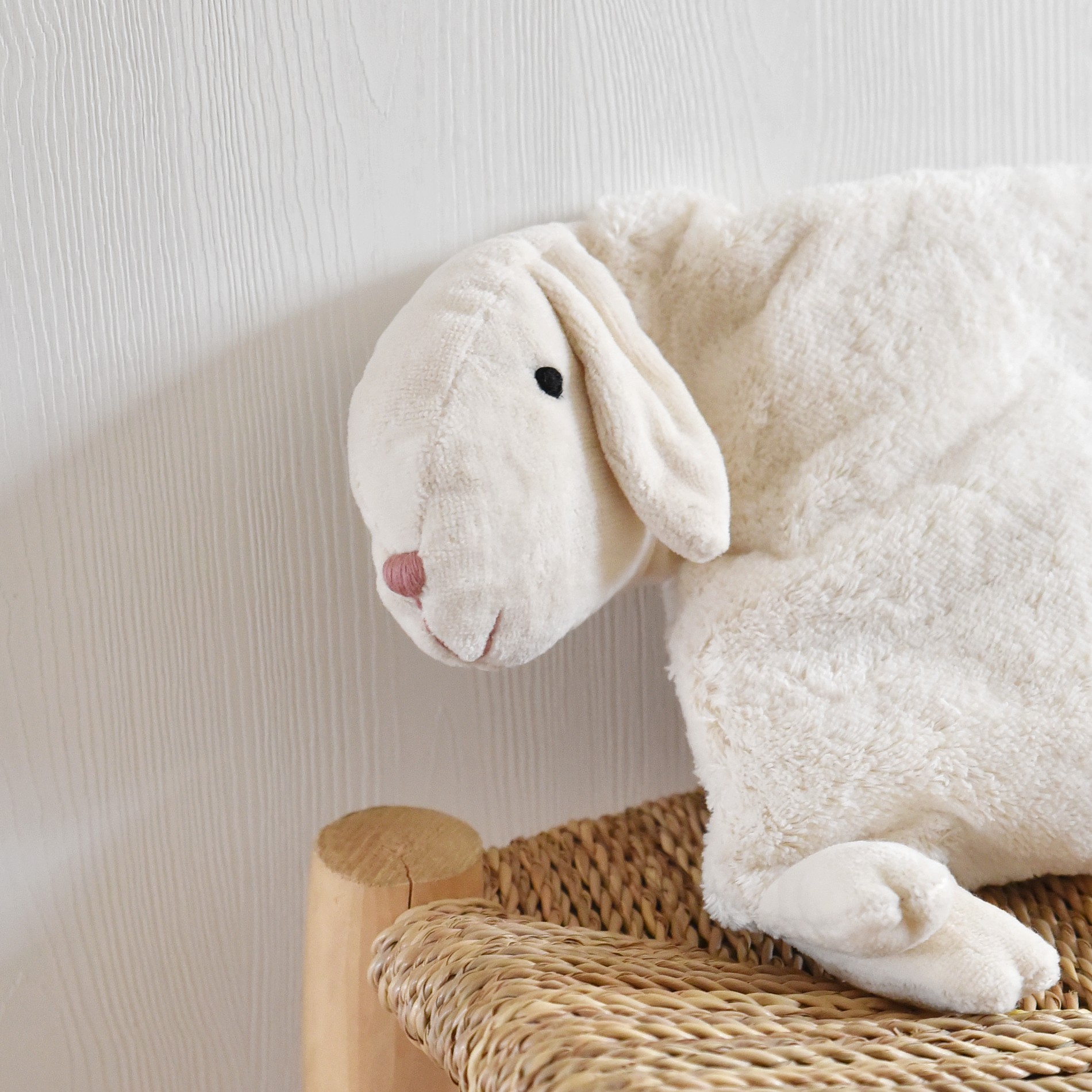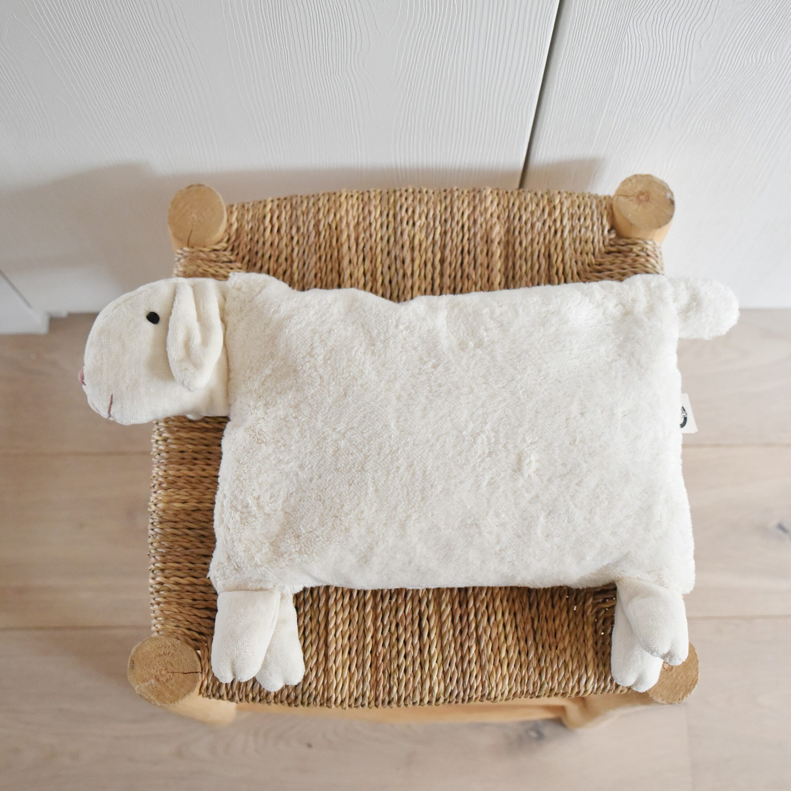 Matière : tête et pieds en laine de mouton, extérieur en coton bio et sachet de copeaux de pin cembro